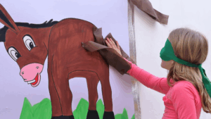 Dale un giro a este clásico infantil. En lugar de un burro, usa una foto o dibujo en tamaño real de una celebridad, mascota o incluso del homenajeado. Los jugadores con los ojos vendados deben girar y luego “colocar” algo gracioso (bigote, accesorio) en el lugar correcto.